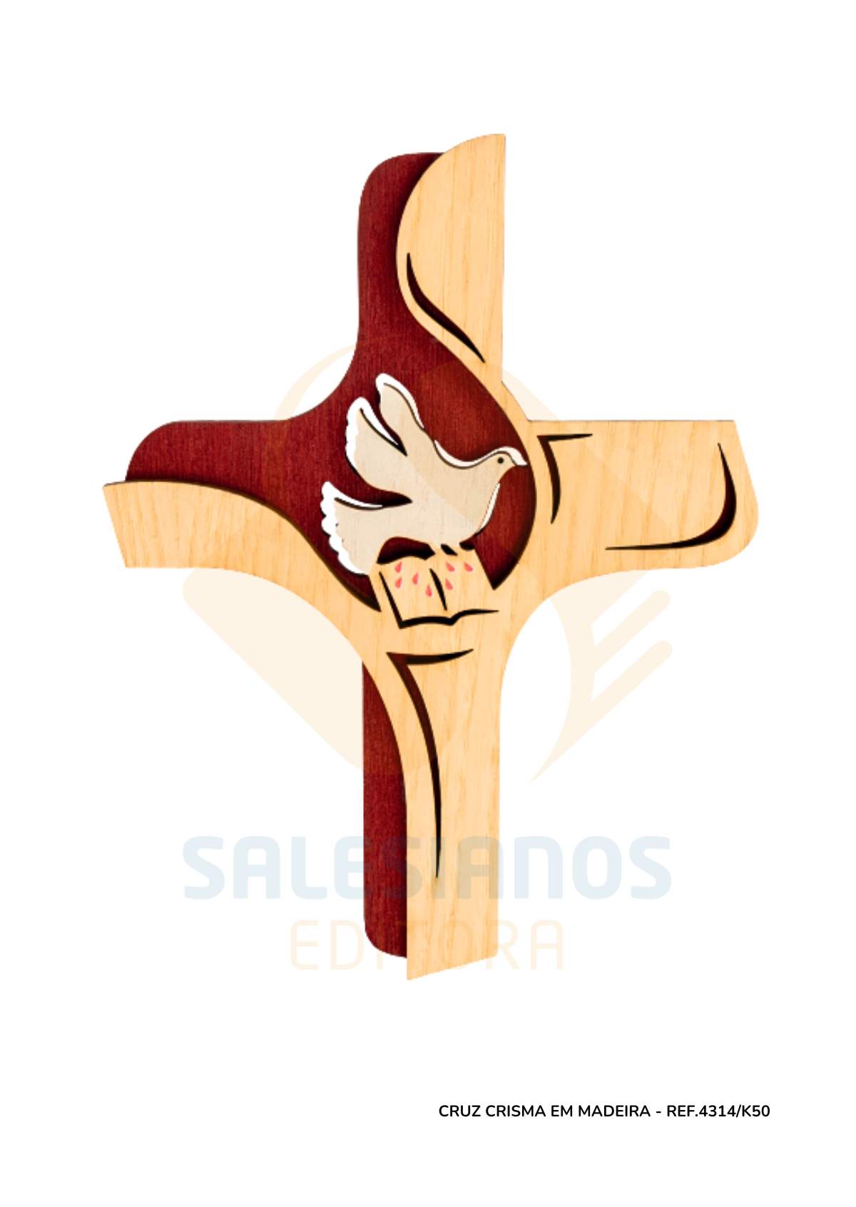 No centro da cruz está a recortada a representação da pomba, símbolo do Espírito Santo, a Palavra e sete línguas de fogo numa alusão aos sete dons do Espírito.